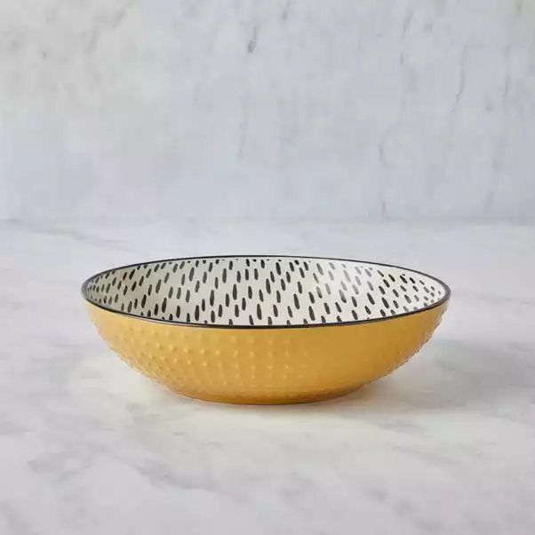 Boasting a stylish dashed pattern with a spotted embossed outside, this bowl is the perfect contemporary addition to your kitchen or dining room table. With a colourful rim, this bowl adds the perfect splash of colour to your home. Dishwasher safe, this bowl is easy to clean, other matching crockery is also available.