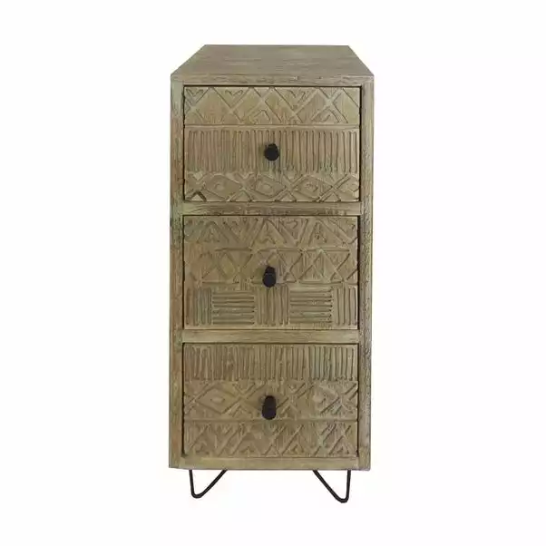 Stylish in design and crafted from wood, this three tier drawer unit from the Elements range has been decorated with a tribal pattern carved into the front of each drawer.
