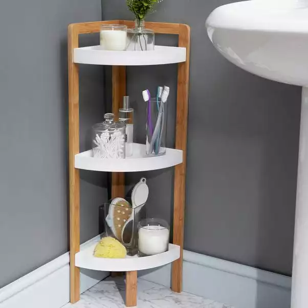 Featuring three white shelves and a bamboo finish, this practical corner caddy is easy to wipe clean and makes an ideal space-saving accessory for your bathroom.