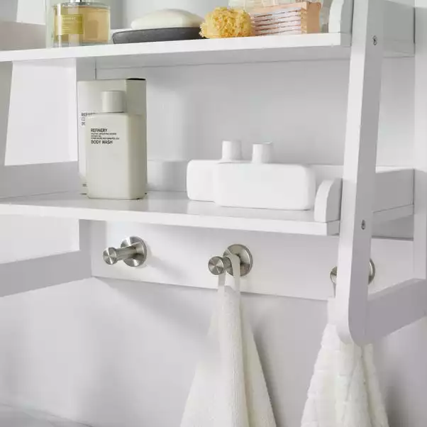 Boasting a clean, crisp painted finish, this shelving unit is perfect for storing and showcasing all your bathroom essentials. With a timeless design, that would compliment any bathroom interior, you can style these shelves however you like. With stylish chrome hooks and three shelves in a ladder formation, this shelving unit provides you with ample storage space. This unit is easy to assemble and is also available in grey.