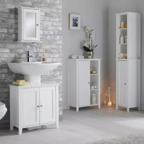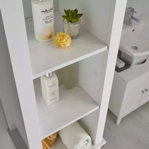 Featuring a contemporary marble effect with chrome handle to finish, this Tall Cabinet looks sleek and stylish, perfect for your bathroom space. It boasts 3 open shelves and 2 interior shelves, offering ample storage space for your home. Coordinate with our other marble bathroom storage units and accessories to complete the look. This range is exclusive to Dunelm.